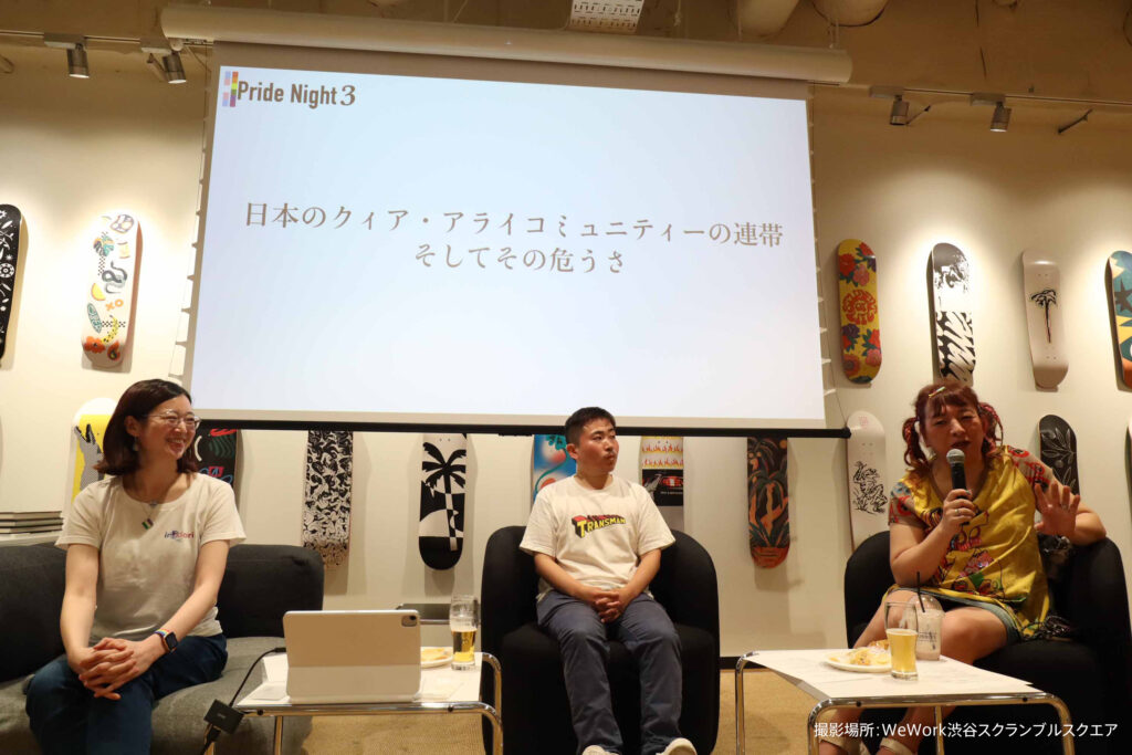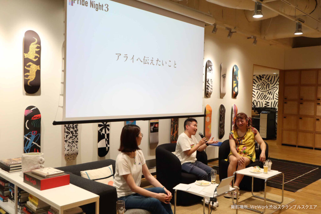 パネルディスカッションの最後は「アライへ伝えたいこと」。分断の時代だからこそ、クィアコミュニティーと連帯するアライの存在が重要だと考える3人から、参加者の皆さんへメッセージをお送りしました。